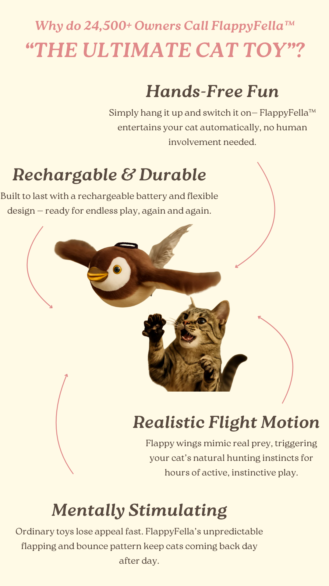 FlappyFella™ gives your cat the stimulation they crave, hands-free. No wands, no lasers, no effort.